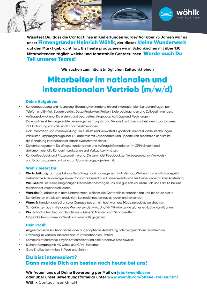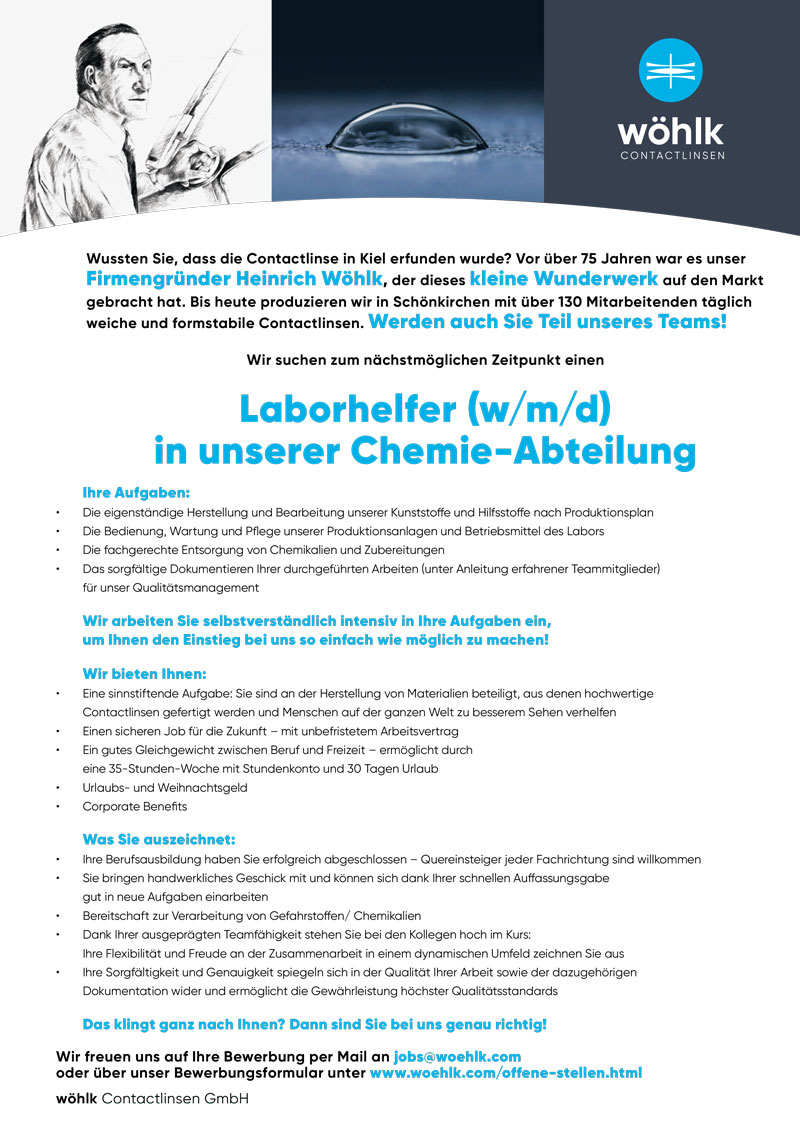 Ob nach der Schule, dem Studium oder auf der Suche nach einer beruflichen Perspektive: Mit einem Praktikum bei Wöhlk – dem Erfinder der Contactlinse – erhalten Sie interessante und spannende Einblicke in das Berufsleben bei einem international erfolgreichen Contactlinsenentwickler und -hersteller.